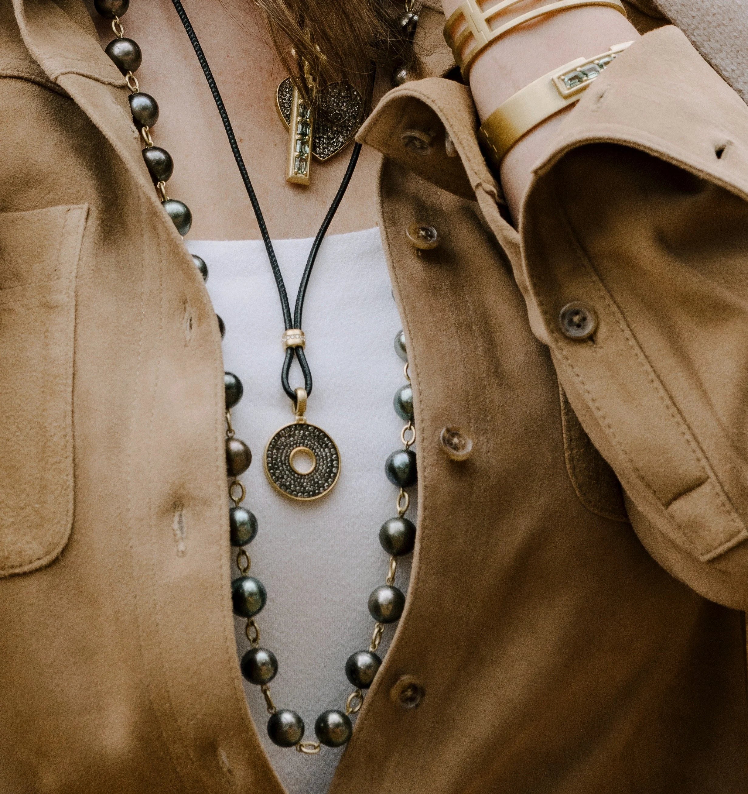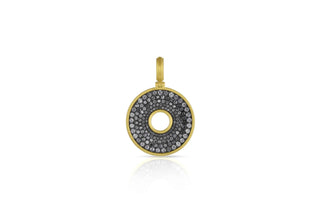This pendant features the Amani collection’s signature graduated pavé. The reverse side has the word “PEACE” engraved in several of the world’s most commonly used languages. It reminds us of the importance of friendship and collaboration. In 18K yellow gold with a bail that opens, this pendant can be clipped to any of our chains or cords, sold separately. Antiqued black rhodium compliments the grey diamonds.