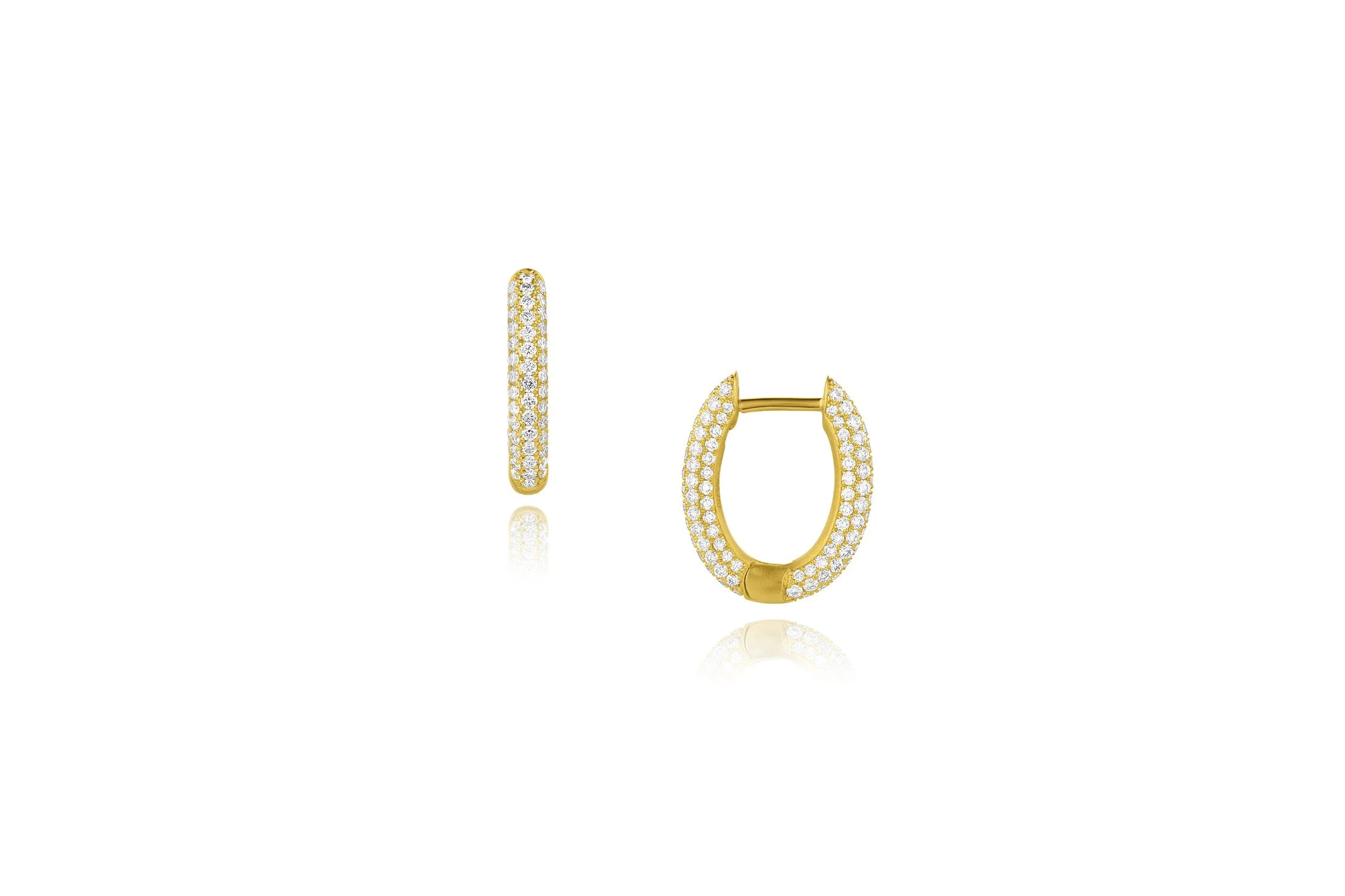 Quiet luxury is in the details. Five rows of meticulous pavé smoothly follow the curve of the front and back of the earrings. The hoops feature a flattering oval shape, a new classic. Their hinge and snap construction make them easy, comfortable and secure to wear.