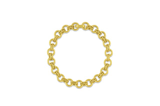 A chain so perfect it needs no other title than Good Gold Chain. Round links lay flat, alternating with double oval links. With such a pleasing weight and scale, it’ll be a piece you want to put on but never take off. This 18K yellow gold bracelet is 7.5” with a snap over clasp.