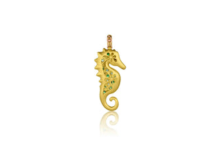 Our Medium Seahorse Pendant is bound to delight. It features a playful scattering of gemstones and is a cheerful addition to any jewelry collection. A pattern reminiscent of paisleys or flowers adds interest to the pack of the pendant. An opening bail makes this pendant easy to layer.