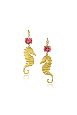 From a distance these earrings look like an abstract form. On closer inspection seahorses sway delightfully beneath beautiful gemstones. These earrings add a subtle whimsey to your day.