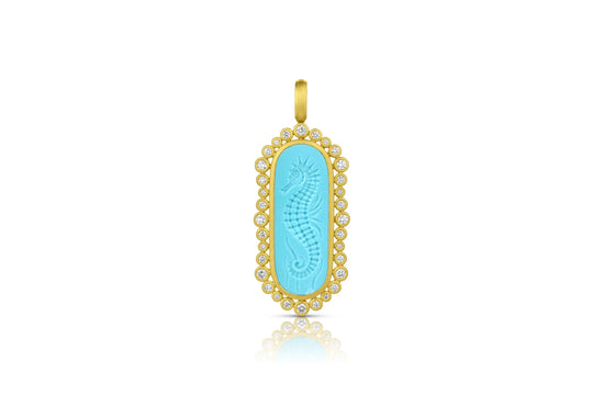 A seahorse floats in a sea of turquoise in this hand-carved intaglio. A bubbly halo of diamonds surrounds it. A custom carved back completes this whimsical yet elegant one of a kind pendant. Diamonds G/H VS...Regular price $12,720.00 -