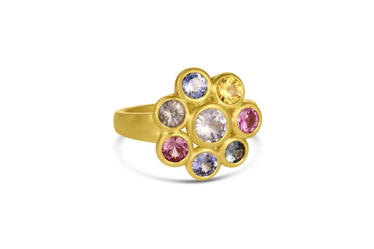 The Flora Collection is colorful and playful. Multi color sapphires are arranged into charming flowers. This whimsical ring features an asymmetric design. Due to the nature of the gemstones, each ring is unique. 18KYGMulti color sapphires...Regular price $15,100.00 -