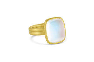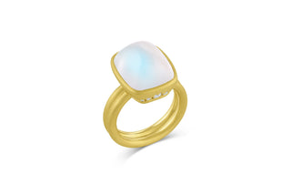 A dreamy African moonstone glows as if lit from within. Sparkling diamond pavé creates a subtle scallop on the profile of the bezel. Warm satin finished 18K yellow gold enhances the ring’s radiance.