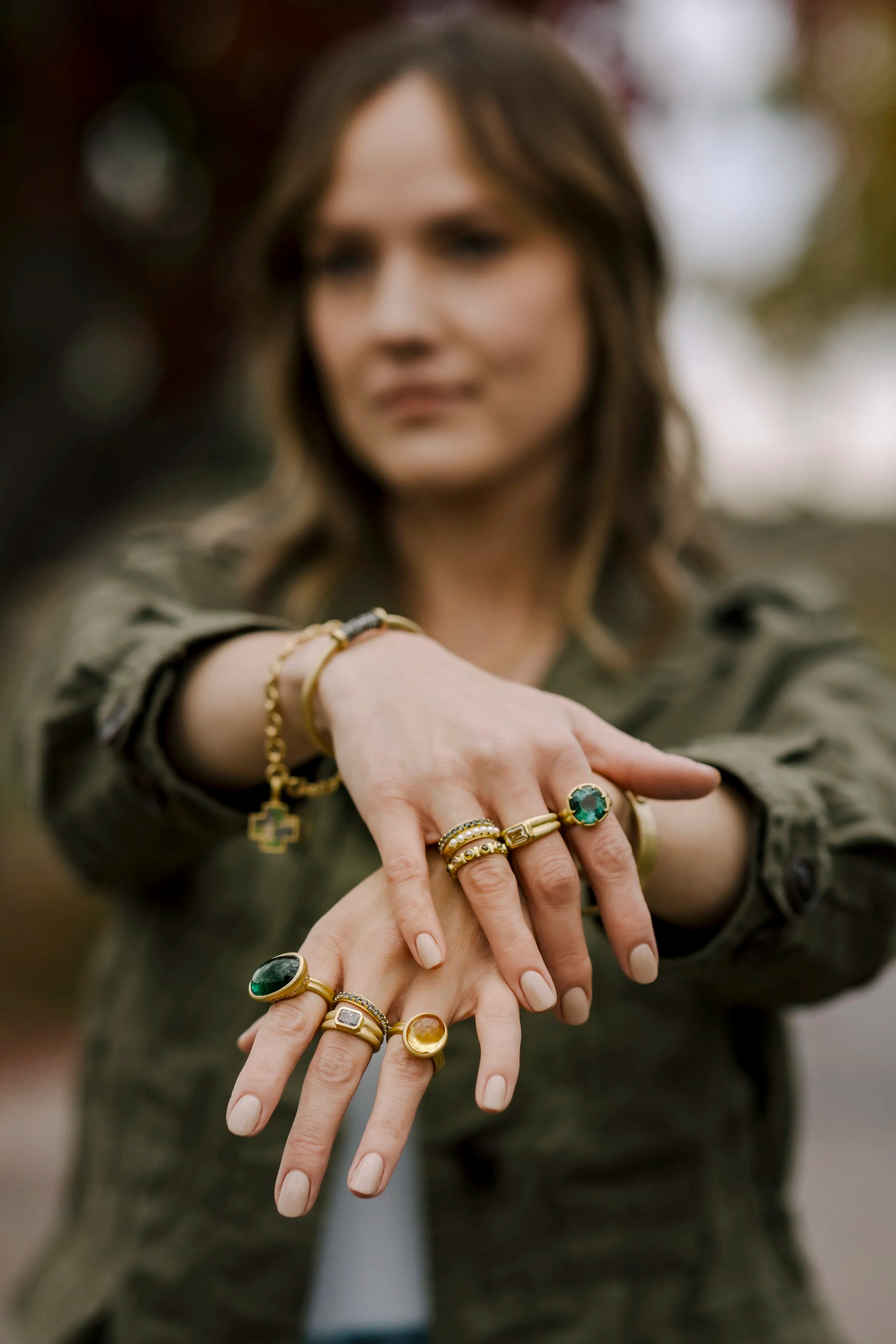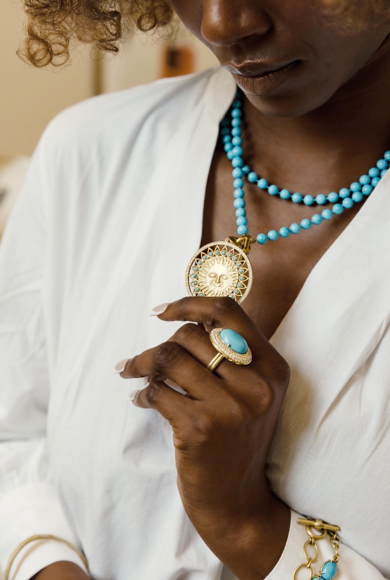 Layering your jewelry is fun but please layer carefully. When jewelry rubs or knocks into each other the gold and gemstones can become scratched or damaged. Avoid situations where a hard gemstone like a diamond, sapphire or ruby would rub against soft gemstones like turquoise or pearls.