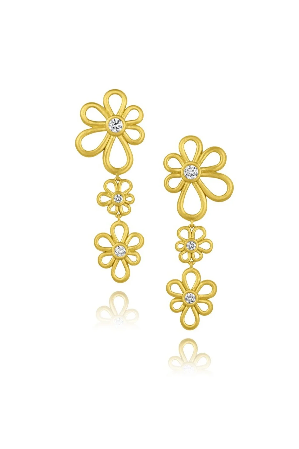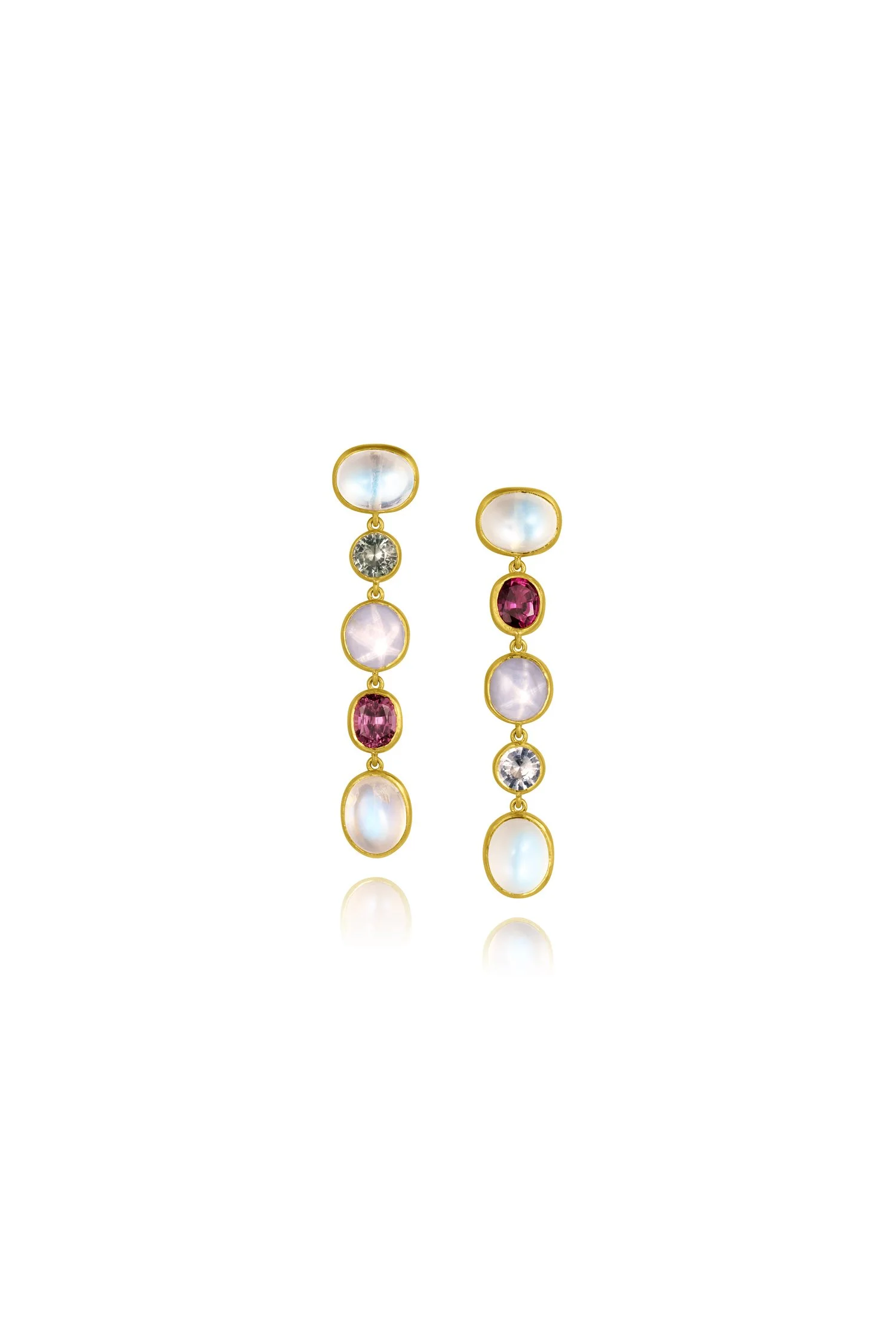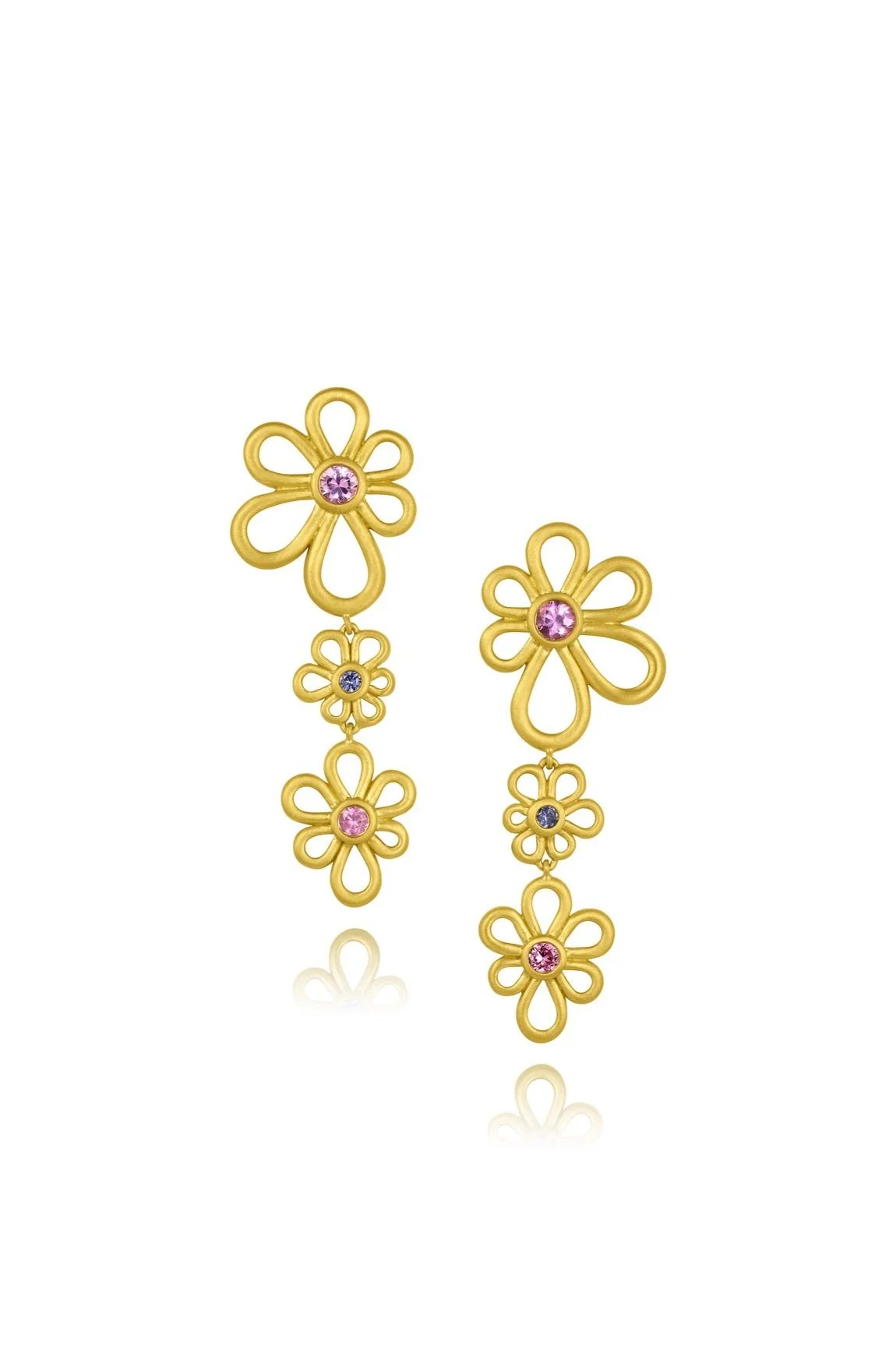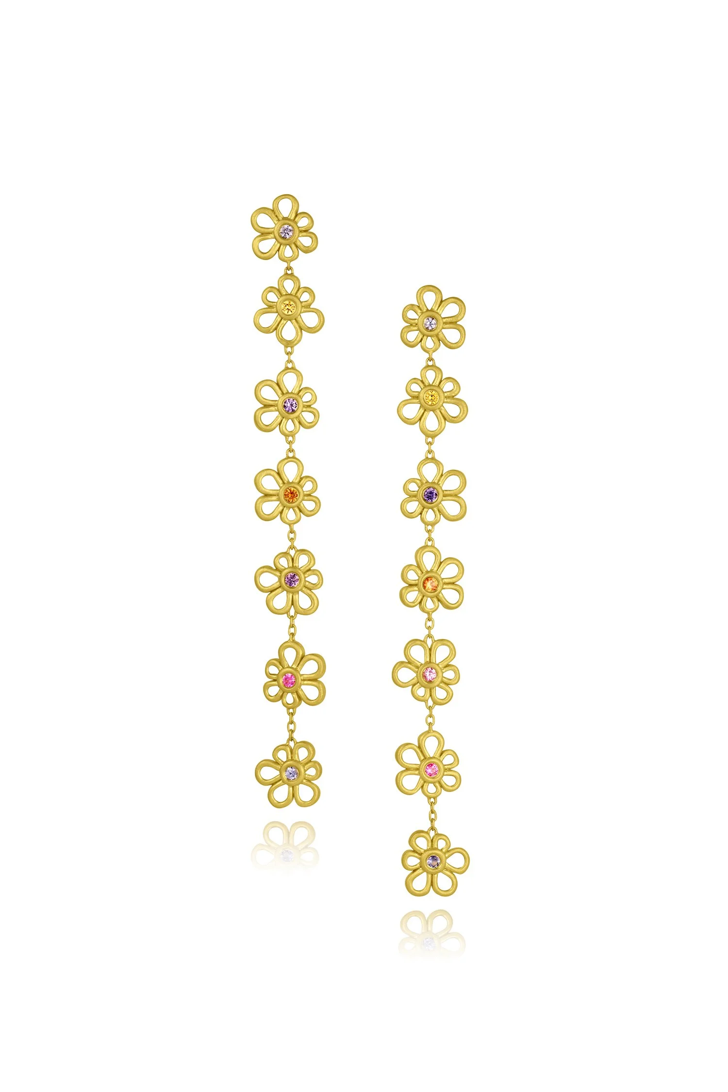 Kelly is wearing Long Flower Dangle Earrings - Purple, Blue & Pink Sapphire, Mixed Sapphire Flower Necklace - Multi Color Sapphire, Wave Bead Necklace - 20", Flora Heart Pendant - Diamond, Scallop Diamonds Ring - Pink Tourmaline, Ridged Band, Flora Frame Bracelet - Mixed Sapphire, and Oval Cabochon Bracelet with Flower Clasp.